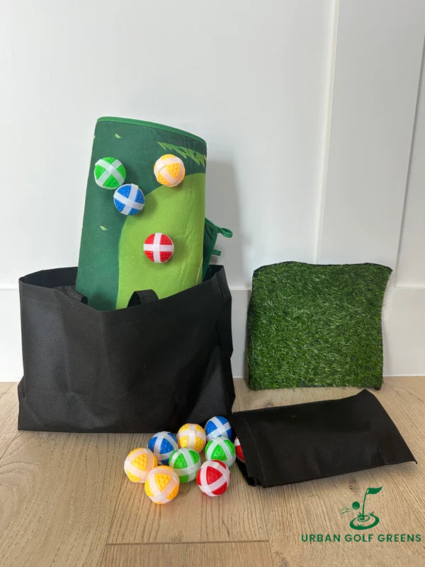 Great Question! Well pretty much everything you need. You get the large Mat, 20 balls (5 x 4 Different Colours), Ground Pegs for Outside Summer Use and a chipping Mat to chip from. The only this we cannot send is the golf club but you can pick that up from any local charity shop if you do not have one already.